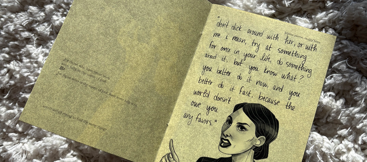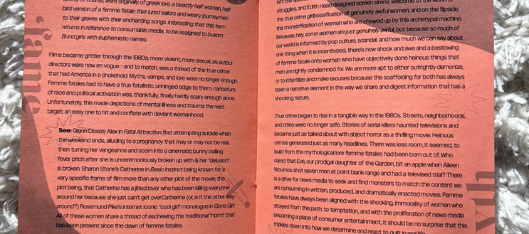 to reimagine. Represented in this run of sister zines are manic pixie dream girls, damsels in distress, Law & Order SVU, my five years (and counting) of bartending, bridal pressures, and femme fatales; all in a range of tone and execution. They are all black and white on varied color stock, as I want these to be pieces that can be readily made and distributed; something that is unobtainable for the multimedia works I’ve created for this project. Their content is, to me, more important than their permanence; the guts are more of a living document of my standing in these topics and understanding of the perpetuation of these narratives.