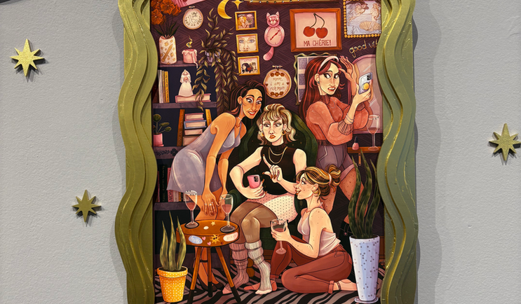 see necessary for acknowledging survivors with. Reclamation and adaptability are important themes within my work, along with depicting women in a way that feels non-exploitative; and my own experience in healing has definitely informed the way I’ve traversed these themes. The physical dimension in these spaces are intentionally built to feel more compressed and claustrophobic; as if everything has been designed to live in one plane, pushing the artificeof traditional gaze on women’s bodies. Everything is happening all at once. It became important that every aspectof these pieces was inherently mine; from the designed frames, to the smallest handlings and details or mixed media applications, to the written voice and verbiage that engages with the audience.